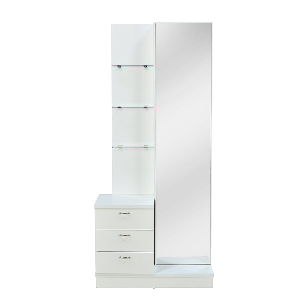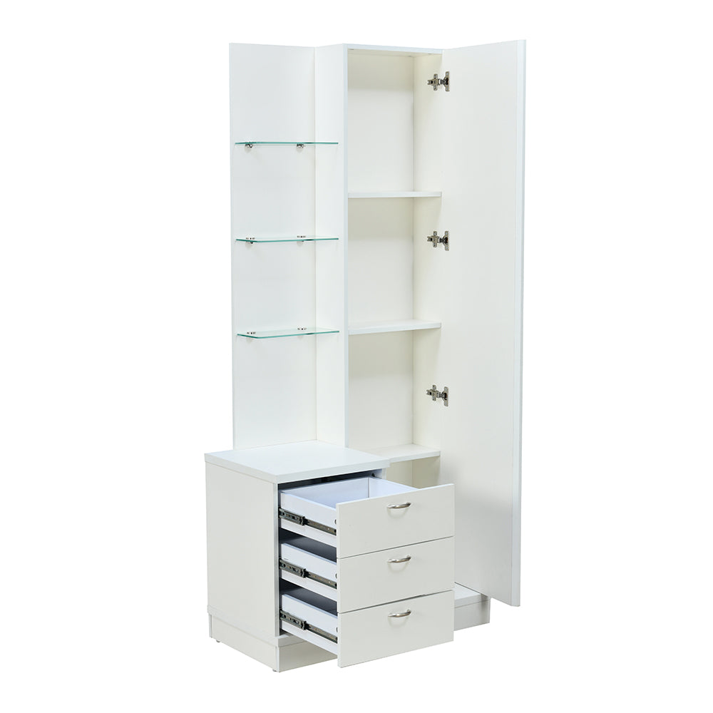 - Two drawers and a cabinet to store makeup and styling tools